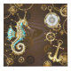 Brown wooden background with sea, mechanical ridge, an antique steering wheel, golden anchor and various gold and brass gears. Steampunk style.