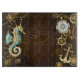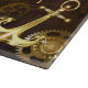 Brown wooden background with sea, mechanical ridge, an antique steering wheel, golden anchor and various gold and brass gears. Steampunk style.
