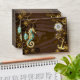 Brown wooden background with sea, mechanical ridge, an antique steering wheel, golden anchor and various gold and brass gears. Steampunk style.