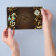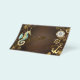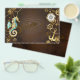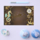 Brown wooden background with sea, mechanical ridge, an antique steering wheel, golden anchor and various gold and brass gears. Steampunk style.