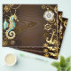 Brown wooden background with sea, mechanical ridge, an antique steering wheel, golden anchor and various gold and brass gears. Steampunk style.