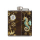 Brown wooden background with sea, mechanical ridge, an antique steering wheel, golden anchor and various gold and brass gears. Steampunk style.