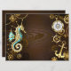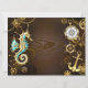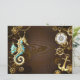 Brown wooden background with sea, mechanical ridge, an antique steering wheel, golden anchor and various gold and brass gears. Steampunk style.