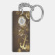 Brown wooden background with sea, mechanical ridge, an antique steering wheel, golden anchor and various gold and brass gears. Steampunk style.