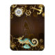 Brown wooden background with sea, mechanical ridge, an antique steering wheel, golden anchor and various gold and brass gears. Steampunk style.