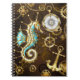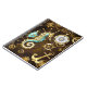 Brown wooden background with sea, mechanical ridge, an antique steering wheel, golden anchor and various gold and brass gears. Steampunk style.