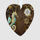 Brown wooden background with sea, mechanical ridge, an antique steering wheel, golden anchor and various gold and brass gears. Steampunk style.