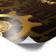 Brown wooden background with sea, mechanical ridge, an antique steering wheel, golden anchor and various gold and brass gears. Steampunk style.