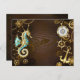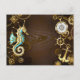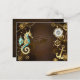 Brown wooden background with sea, mechanical ridge, an antique steering wheel, golden anchor and various gold and brass gears. Steampunk style.