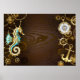 Brown wooden background with sea, mechanical ridge, an antique steering wheel, golden anchor and various gold and brass gears. Steampunk style.
