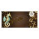 Brown wooden background with sea, mechanical ridge, an antique steering wheel, golden anchor and various gold and brass gears. Steampunk style.