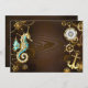 Brown wooden background with sea, mechanical ridge, an antique steering wheel, golden anchor and various gold and brass gears. Steampunk style.