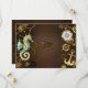 Brown wooden background with sea, mechanical ridge, an antique steering wheel, golden anchor and various gold and brass gears. Steampunk style.