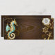 Brown wooden background with sea, mechanical ridge, an antique steering wheel, golden anchor and various gold and brass gears. Steampunk style.