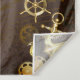 Brown wooden background with sea, mechanical ridge, an antique steering wheel, golden anchor and various gold and brass gears. Steampunk style.