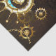 Brown wooden background with sea, mechanical ridge, an antique steering wheel, golden anchor and various gold and brass gears. Steampunk style.
