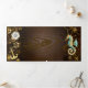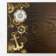 Brown wooden background with sea, mechanical ridge, an antique steering wheel, golden anchor and various gold and brass gears. Steampunk style.