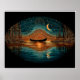Crescent moon over a wooden canoe in a northern forest. Constellations in the night sky. Generative art inspired by Scandinavian and North American landscapes.