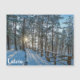 View of snowy pine forest with sun rays coming through and wooden path for relaxing walk. Covered in snow pine, fir and spruce trees.