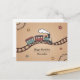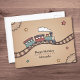 A birthday postcard featuring an illustration of a smiling wooden train chugging along a winding track. The card background is a warm, gradient textured beige with subtle details like wooden gears and hand-drawn stars. A nice illustration to send for a child's birthday or a wooden toy lover's birthday.