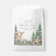"Let the Adventure Begin!" with this sweet woodland-themed baby shower napkin. The design features a soft watercolor scene with forest animals — a deer, fox, raccoon, mouse, and hedgehog — gathered in a peaceful meadow surrounded by tall pine trees.