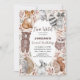 Celebrate your little adventurer's milestone with a charming invitation that captures the spirit of a magical woodland journey. This delightful invitation features a whimsical gathering of adorable woodland animals, each lovingly handcrafted in soft and dreamy watercolors. The sweet faces of a curious fox, a playful rabbit, a mischievous squirrel, a gentle bear, a chirpy bird, a wise owl, a masked racoon, and a spiky hedgehog will immediately capture the hearts of your guests. Surrounding the woodland creatures is a delicate arrangement of autumn foliage, embracing the beauty of the changing season. The earthy tones and warm hues of the foliage complement the watercolor illustrations, adding a touch of cosiness to the overall design.