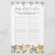Woodland animals themed baby shower ABC's race game card features a watercolor woodland animals illustration and watercolor greenery eucalyptus garland and elegant handwritten style font.