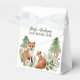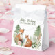 Soft Watercolor Design for a Whimsical Celebration Featuring a Deer, Rabbit and Fox amongst a woodland fir tree background.