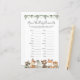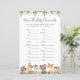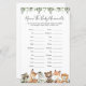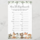 Woodland animals themed baby shower name the baby animals game card features a watercolor woodland animals illustration and watercolor greenery eucalyptus garland and elegant handwritten style font.