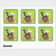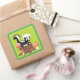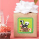 This design features a black and white skunk sitting on a tree stump next to red and white mushrooms. The background is a grassy green square bordered by diagonal stripes in two shades of green.
