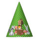 This party hat features a trio of woodland animals sitting on and around a tree stump and red and white mushrooms. A grey and black racoon sits to the left of the stump, a brown and tan squirrel holding an acorn sits on top of the tree stump, and a blue-ish grey bunny rabbit holding pink and purple flowers sits to the right of the tree stump. The background of the hat features a repeating pattern of two-tone green stripes. Click "Customise It" to add text or to change the design.