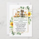 Watercolor Woodland Animals Baby Shower Invitation. Baby Animals include Bear, Deer, Moose, Racoon, Bunny Rabbit, Fox and Owl on eucalyptus leaves and forest greenery. Gold frame with botanical greenery and sunflowers.