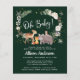 Cute rustic budget-friendly winter baby shower invitation featuring watercolor illustrations of woodland animals, florals, greenery and gold stars and snowflakes. "Oh Baby!" and the mother-to-be's name are written in light cream scripts against a dark hunter green background.