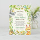 A charming woodland themed baby shower invitation. This gender neutral baby shower invite features adorable hand-illustrated forest animals, including a sweet little fox, a smiling racoon, two singing birds, and even a cute tiny hedgehog. A wreath of lush forest foliage frames the baby shower details. Easily personalise with your shower information.
