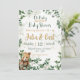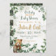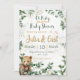 A baby shower-ready template, with a cute bear and greenery around as trends still running some glitter and great fonts and colours.