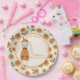 Decorate your whimsical woodland celebration with this charming baby shower paper plate. It showcases a sweet hand-drawn bunny rabbit in a mustard dress surrounded by a warm earthy floral pattern. This design is ideal for parents hosting a forest-themed party for a new arrival.