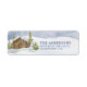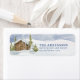 These wintery return address labels feature cosy log cabin home covered in snow with a cute snowman nearby.
