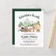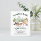 Budget-friendly rustic couples baby shower invitation featuring a cute illustration of woodland animals camping with their tent and campfire in the mountains and forest and "Adventure Awaits" and the names of the mother and father in a dark green script.