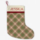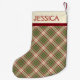Personalised stocking with a Plaidwerx original natural woodland Christmas plaid pattern in moss green, cranberry red, and cream. Designed to hang facing either direction. Available in two sizes and three fabric types.