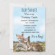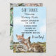 Woodland Creature Animals Baby Shower Invitations. A cute baby deer, hedgehog and fox sit on a rocky woodland scene.