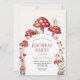 Birthday invitation featuring an arched frame of watercolor mushrooms. Customise with your information. Click "click to customise further" to change the font style, size or colour.