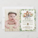 Whimsical 1st birthday invitation featuring illustration of rustic watercolor greens, foliages and adorable forest animals: fox, deer, bear and raccoon