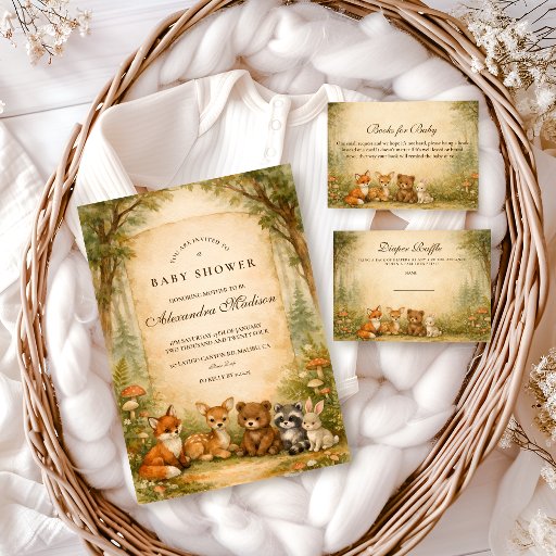 A heart-melting woodland design featuring a sweet gathering of forest friends beneath a soft storybook canopy. Fox, fawn, bear, raccoon, and bunny sit together in a warm autumn meadow framed by gentle trees and vintage parchment tones. The earthy palette and delicate botanical details create a cozy, nostalgic feel—perfect for a nature-inspired celebration. Fully customizable to make it uniquely yours.