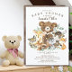 Cute baby shower design featuring the sweetest bear sitting on a tree stump surrounded by a deer, racoon, squirrel, fox, moose & fox. Framed with natural green watercolor leaves set on a white background. Flip our invite over to view a rustic wood back for an extra special touch..