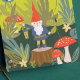 Whimsical green and red woodland themed illustration designed by Shelby Allison featuring a tiny gnome character, mushrooms, flowers and foliage.