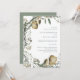 This lovely holiday wedding invitation features a watercolor wreath full of crisp golden pears and forest mushrooms, and lots of green foliage.