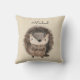 A whimsical cute watercolor woodlands animal hedgehog throw pillow with a faux linen texture backgorund, for baby nursery decor. A perfect baby shower or new baby gift. Personalise with your baby's name. Neutral earthy cream and brown colours.