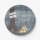 Baby Shower Plates featuring an illustration of a mama and baby fox snuggling under a tree in the forest at night surrounded by stars.