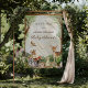 A charming woodland welcome design featuring soft watercolor trees and adorable forest animals in a warm storybook setting. The deer, squirrel, raccoon, bunny, hedgehog, and bird create a gentle rustic look that is perfect for a nature-inspired baby shower celebration. Soft greenery and earthy tones make this design a beautiful choice for a gender-neutral event and coordinated woodland party decor. A lovely poster for welcoming guests to a cozy woodland baby shower.