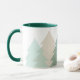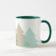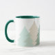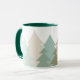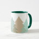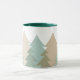 This ceramic coffee mug is shown in a refreshing image of woodlands fir tree print.